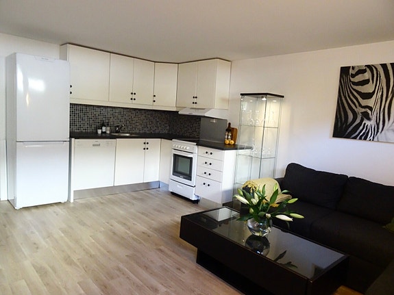 Leiligheten leies ut fullt møblert med moderne møbler og har gulvvarme i alle oppholdsrom. Stort bad med store flis på vegg og gulv.