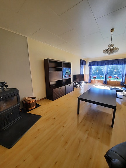 Husets vegger/tak er noe malt panel og resten hvit panellakk. Kjøkkenet er heltre malt i bonderød og har alle hvitevarer intergrert. Parkett /flisbelagte gulv m varmekabler. Vedfyring i peis og grue 1 etg . (Det er muligheter for å produsere egen ved her. )Stor stue med åpen løsning fra kjøkken og spisestue. Toalettrom nede og bad m dusj oppe. 3 soverom. Vaskerom i 1 etg med egen inngangsdør utenfra. Vinterhage som er veldig koselig med peishygge hele året. Kan leies ut delvis møblert. Dyrehold etter avtale .