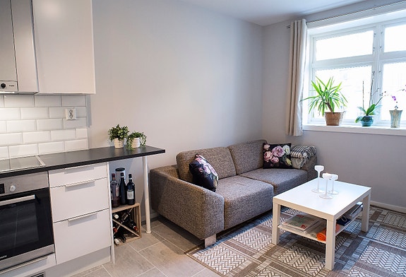 Nyere leilighet på Nordnes. Møblert med sofa, dobbelseng (sengen på bildet er 120, men det er satt inn en ny dobbelseng) stuebord, alt av hvitevarer og vask- og tørketrommel.
