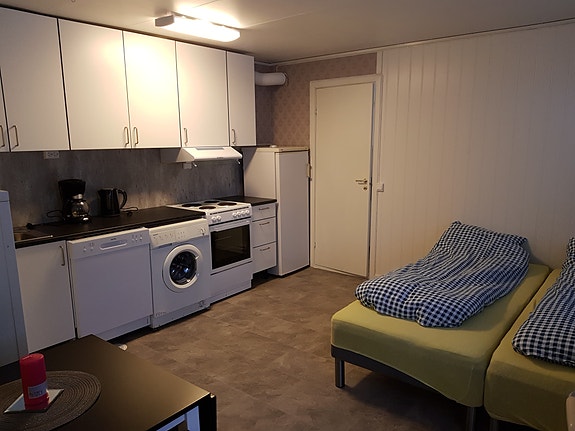 Delvis møblert leilighet klar for utleie. Leiligheten består av yttergang, oppholdsrom og bad/toalett. Det er egen inngang. I leiligheten er det oppvaskmaskin, komfyr og to senger. I tillegg står det en vaskemaskin og et kjøleskap der, som du kan få låne. Det er stor parkeringsplass, og utekontakt for motorvarmer.