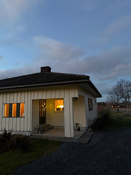 Enebolig i solrik og landlig omgivelser leies ut. Romslig og flat tomt, med epletrær og bærbusker. Eneboligen har ett soverom, men mulighet for å endres til to. Plass til vaskemaskin og tørketrommel på badet. Huset har kjeller. Varmepumpe nylig installert. Leies ut med komfyr og kjøleskap.