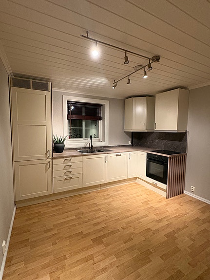 Lys og pen nyoppusset hybelleilighet med eget soverom, romslig bad, stort og fullverdig kjøkken og stue i ett, stor bod/garderoberom, romslig inngangsparti, privat uteplass med ettermiddags/kveldssol og parkeringsplass.