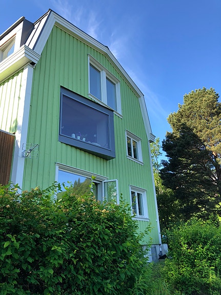 Huset (fra 1952) er oppgradert med bergvarme, balansert ventilasjon, energieffektive vinduer og miljøvennlig isolasjon av resirkulerte aviser.