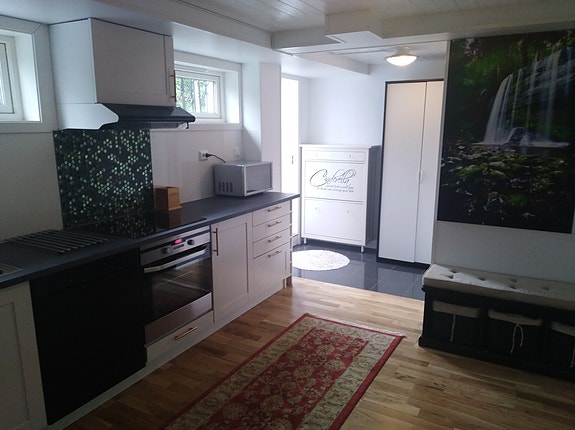Leilighet er fullt møblert, og fellesområder har 1 stue, 1 bad og kjøkken. Kjøkkenet er stort med kjøleskap, fryseskap, vaskemaskin og har alle hvitevarer.