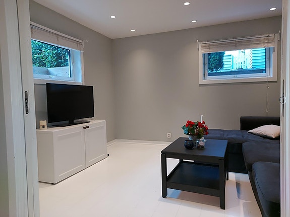 Lys, moderne og romslig sokkelleilighet med egen inngang og hage – idyllisk beliggenhet på Bogstad
