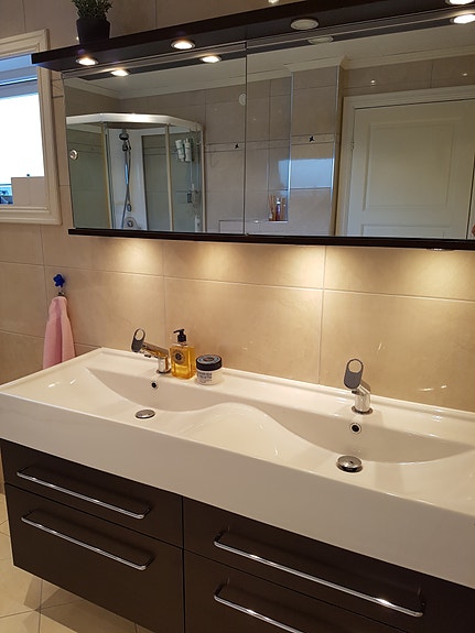 Stort flislagt bad med downlights og vamekabler i gulv.