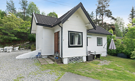 Eneboligen har en vakker og solfylt beliggenhet med stor boltreplass på både gressplen og gårdsplass.