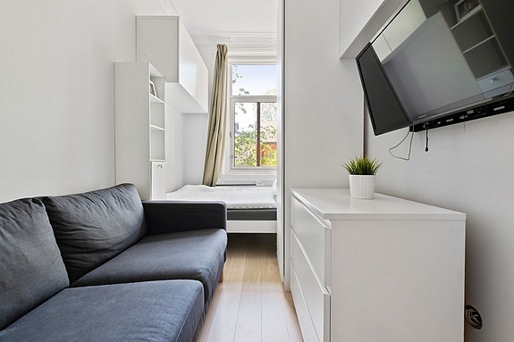 Rommet er møblert med dobbeltseng, skap, hyller, skrivebord, sofa og TV og har praktisk hems for oppbevaring. Hvert enkelt rom har egen kodelås.