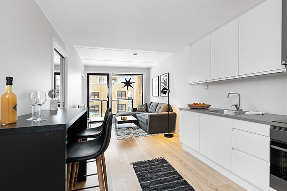 Leiligheten har godt gjennomtenkt planløsning for optimal utnyttelse av arealet. Den er topp moderne med solide materialer som gjennomgående, lekker 1-stavs parkett fra Boen og et moderne kvalitetskjøkken fra HTH komplett med integrerte hvitevarer.