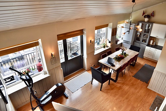 Heis. Åpen kjøkkenløsning, soverom i 19 kvadratmeter innglasset hems med takluke.