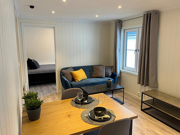 Leiligheten har spiseplass med spisebord og to spisestoler, kjøkken med benkestående ovn, sofakrok med sofa, sofabord og lenestol, og soverom med rammeseng, nattbord, garderobeskap og kommode. Øvrig interiør på bildene følger ikke med, slik at du kan innrede slik du måtte ønske.