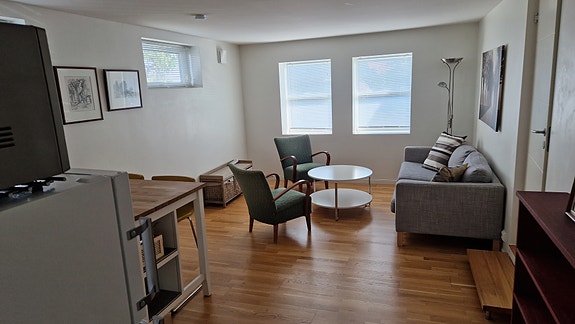 Stue med kjøkken som inkluderer kombinert kjøle/fryseskap, keramisk platetopp og stekeovn, samt oppvaskmaskin. Parkett. Varmekabler i gulv.