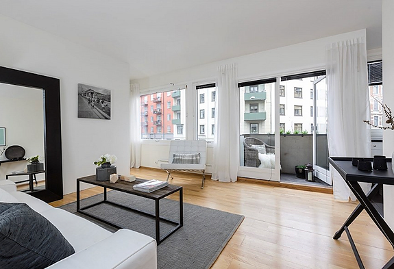 Leiligheten er delvis møblert. Møblene på bildet av stuen er ikke identiske med de som er der nå, men istedet er det en sofa med chaiselong og et TV-bord. På det største soverommet er det nå en 160x200 dobbelseng og på det andre er det en enkeltseng og med mer skapplass nå enn det var da bildet ble tatt. Leiligheten inneholder stue med relativt ny (2019) enstavsparkett og store vinduer som gir svært gode lysforhold og kjøkken med spiseplass og alle hvitevarer. I tillegg til de to soverommene er det et bad med varmemekabler og en gang med mye skapplass helt til taket. Leiligheten har balkong og det er en bod i kjelleren. Leiligheten ligger i en sidegate til Kirkeveien med kort avstand til Majorstuen T-banestasjon med forbindelser til både byen og Oslomarka. Leiligheten ligger 200 meter fra Frognerparken og ca. 50 meter fra handlegaten Bogstadveien. Nærmeste matbutikk ligger 200 meter unna.