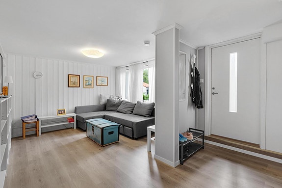Fra kjøkkenet er det en åpen løsning mot stuen. Stuen har plass til