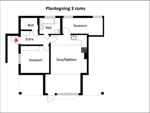Boligen inneholder 2 soverom. Stuen er enkel å møblere. Fra stuen er det utgang til uteplass/terrasse.