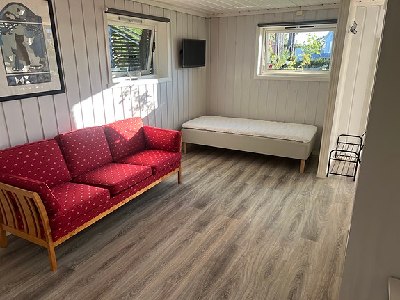 Stue inneholder liten sofa, stuebord, tv-benk m.m.