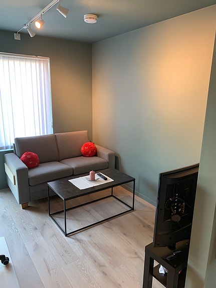 Stue-/kjøkkendel og soverom malt i lun grønnfarge, med store lysflater fra vindu og terrassedør. Utgang fra stue til privat vestvendt uteplass, som vil bli opparbeidet.