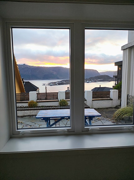 Frå stue er det dør til utestue og stor bod som disponerast av leietakar. Fin uteplass på forsida, med flott utsikt over Ålesund, Sula og Sunnmørsalpane.