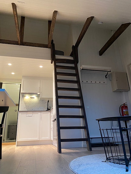 Det er innredet hems over kjøkken som soveplass, hvor det er montert madrass til å sove på.