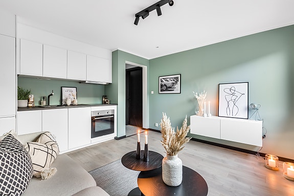 Ny 1-stavs laminat på gulv, og slette vegger malt i moderne fargenyanser.