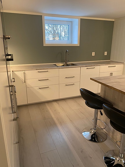 Leiligheten har 2 soverom, åpen stue/kjøkkenløsning, stort bad og egen inngang, Stort kjøkken med øy hvor det er mye oppbevaringsplass. integrerte hvitevarer samt 5 barstoler er inkludert. Romslig stue med innebygd hylle og veggfeste til tv. leiligheten har 2 soverom hvor det ene rommet er stort og det andre mindre, garderobeskap på begge rom. Stor gang med skohylle og knagger. Bade er stort og lyst, mye plass til oppbevaring. Leiligheten er pusset opp 2020.Takhøyde 220 cm og store vinduer som er etter brannforskrifter. Det er varmekabler i gang og bad mens stue, kjøkken og soverom er det varmefolie. Det er 5 termostater i leiligheten så da kan man justere varmen på alle rom etter eget ønske. Det er fibernett, men er ikke inkludert i leien. Leiligheten har eget sikring og vannskap. Leiligheten leies ut for 12000kr eks strøm, kabel tv og internett.
