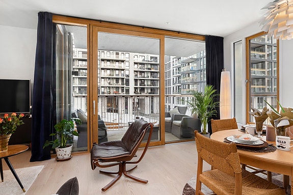 Interiør og møbler er av stilren design og høy kvalitet. Leiligheten bærer preg av en moderne og fresh stil, med en hel eik og retro skildring.