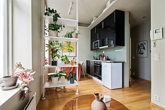 *I oppholdsrommet har du kombinert stue, kjøkken og soveplass. Takhøye vinduer gir rikelig