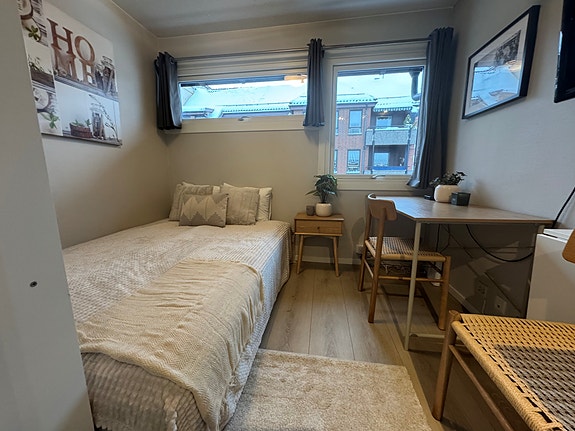 Meget effektiv 1-roms leilighet sentralt i sentrum til leie. Leiligheten har eget bad med dusj, wc, hyller og vask med skap under. Det er 120 cm bred seng , to nye vinduer (2022) som gir mye lys, skrivebord med skap, skuff, spiseplass med stoler, garderobeskap med oppheng, kommode, gang med plass til sko/knagger. Kjøkkenbenk med skap over hvor det er microovn. Ellers kjøleskap med frysedel under benk. Det finnes også et felleskjøkken med komfyr og platetopp i gangen som deles med tre andre. Der har man sine egne skuffer og skap til kjøkkenting. Ellers er det også 2 stk vaskemaskiner og 2 stk tørketromler i etasjen under som kan benyttes.