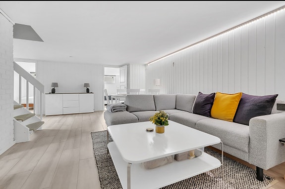 Romslig stue med god plass til stor sofa og spisegruppe i bakkant.