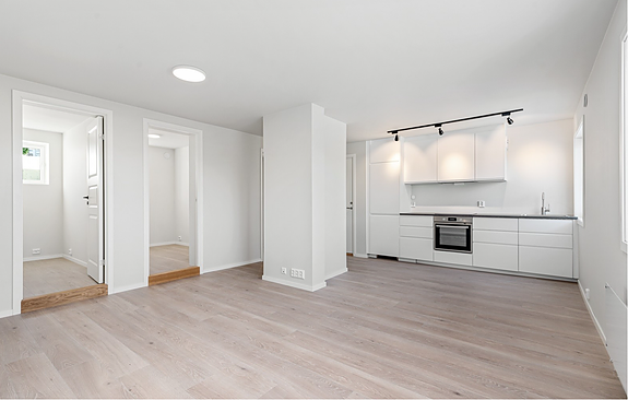 Hele leiligheten ble pusset opp i 2022 med nytt kjøkken, bad, vegger og gulv. Boligen består av egen inngang med romslig entré, åpen stue/kjøkkenløsning, to sovealkover (m. egen dør og vindu) på 5 kvm hver, og bad. Badet er flislagt med varmekabler, det er dusj, toalett og vaskemaskin. Leiligheten har en bod i tilknytning til entréen som disponeres av leietaker. Utenfor inngangen har leiligheten et lite uteområde med plass til stol og bord.