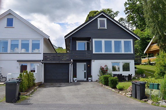 Forsiden av huset, med p-plass til høyre i oppkjørsel