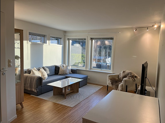Dette er en moderne, lys og gjennomført leilighet med vannbåren gulvvarme i alle rom, inkludert i husleien – ingen ekstra kostnad for oppvarming!
