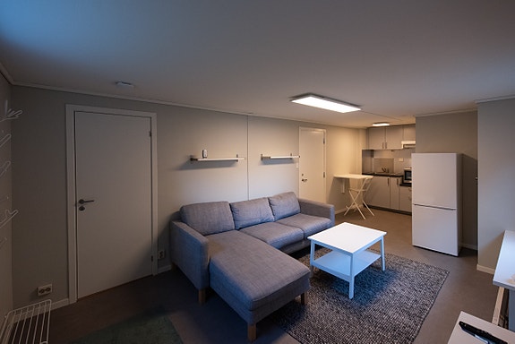 Leiligheten inneholder 1 soverom, bad og kjøkken/stue. Leiligheten er møblert med garderobeskap, sofa, sofabord, tv-benk, tv, nedfellbart kjøkkenbord, kjøkkenstol, skostativ, stumtjener, speil, kjøle/fryseskap, hybelkomfyr og vaskemaskin (toppmatet). Belysning på soverom og stue/kjøkken kan dimmes og fargetemperatur reguleres via fjernkontroll/mobil. I stue er det et stort og et lite vindu, samt vindu i inngangsdør som gir god tilgang på dagslys til tross for at det er en kjellerleilighet. Brannalarm er seriekoblet til øvrige alarmer i enebolig.