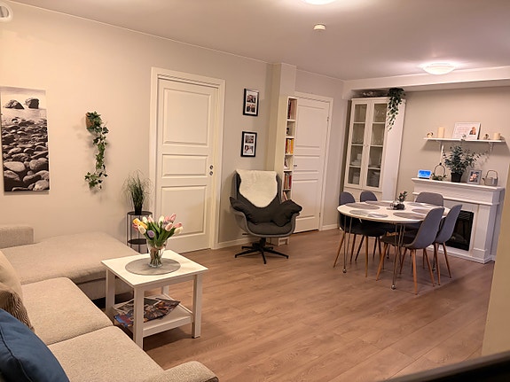 Stuen har god plass til både sofagruppe og spisebord. Det er vannbåren gulvvarme i alle rom, som gir jevn, behagelig varme. Varmtvann og oppvarming er inkludert i leien.