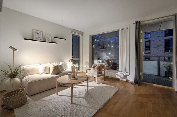 Lys og lekker 3-roms hjørneleilighet i tredje etasje fra 2013. Boligen har slette flater og gjennomgående 3-stavs parkett. Store vindusflater med godt lysinnfall og god romfølelse. Stor, syd-vestvendt balkong på hele 14 kvm med sol så og si hele dagen. God planløsning med gjennomgående store rom. Pent kjøkken og et lyst og romslig bad. Med mulighet for ekstra leie garasjeplass i parkeringskjeller med heisadkomst.