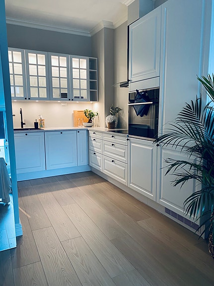 Leiligheten har nyere overflater fra 2021 med både nytt gulv, vegger og kjøkken.