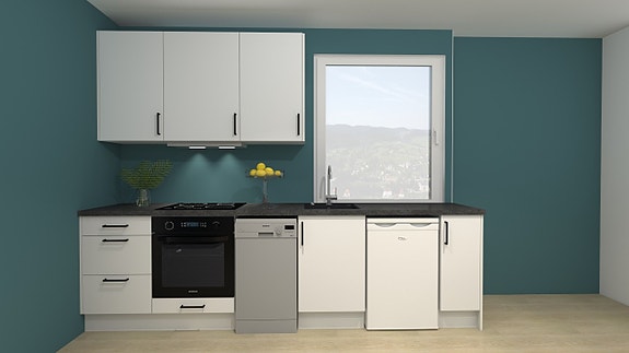 Nytt kjøkken med garderobeskap, kjøleskap, steketopp, og oppvaskmaskin.
