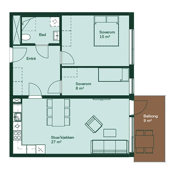 Praktisk 3-roms leilighet i byggets 2. etasje. Leiligheten har to soverom, bad, entre og åpen stue- og kjøkkenløsning. Her får du en leilighet som har godt med oppbevaringsplass i den romslige entreen, samt på soverommene. Baderommet blir levert med fliser på vegg og gulv og du finner opplegg for vaskemaskin ved siden av vasken. Det moderne og lyse kjøkkenet blir levert av kvalitet og byr på mye benkeplass, samt at du har egne soner for spisebord og stue. For den sosiale kan man underholde gjester samtidig som man lager mat. Fra stuen har du utgang til en 8,5 kvm balkong som er nordøstvendt. Her kan du nyte varme sommerdager med venner eller kanskje med en god bok og noe kaldt i glasset.