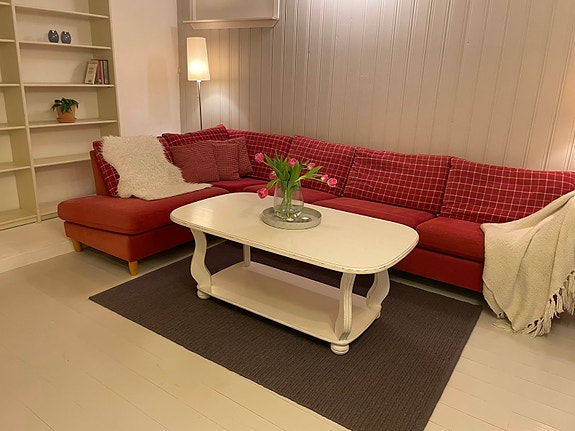 Hybelen er møblert og har dobbeltseng, sofa, stuebord, vaskemaskin/tørketrommel i ett, oppvaskmaskin, kjøleskap med fryser, TV og internett.
