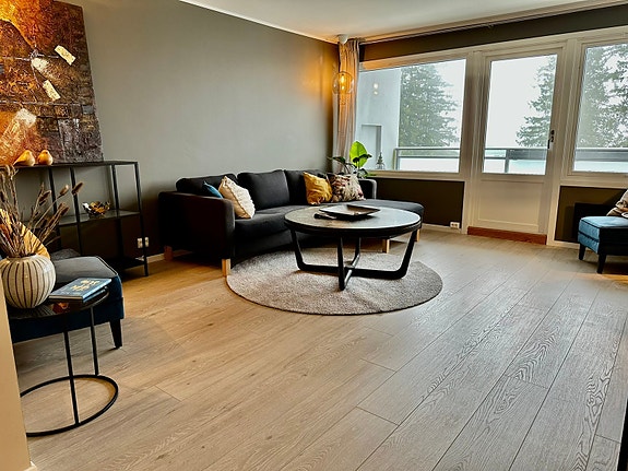 Lys, nyoppusset, smakfull og romslig 4-roms leilighet i toppetasje med parkering i garasje/lader, alt inkludert