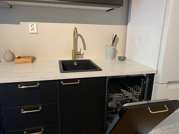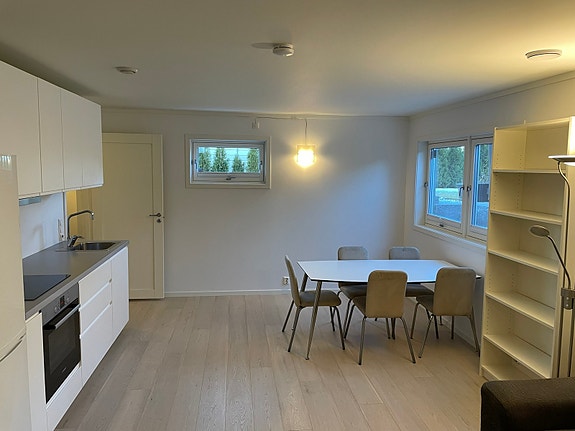 Kjøkkenet er utstyrt med induksjonsplatetopp integrert i benkeplate, integrert stekeovn, kombinert kjøle-/fryseskap, kullfilterventilator og mikrobølgeovn. Godt med skapplass på kjøkkenet.