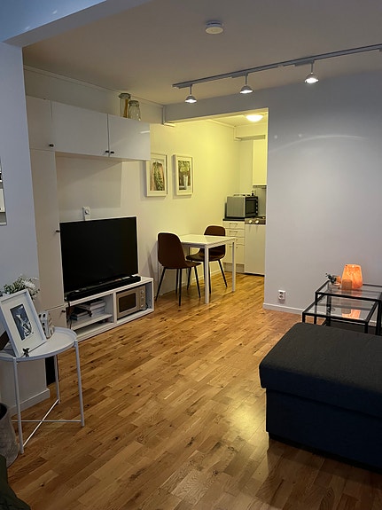 Lys og trivelig 1-roms, med alt man trenger. Leies ut delvis møblert. TV-benk og skap på vegg følger med leiligheten. Internett fra husstanden kan brukes av leietaker uten ekstra kostnad. Strøm er inkludert.