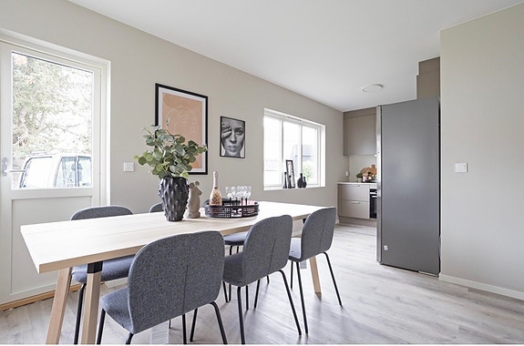 Vi leier ut to moderne leiligheter som ligger vegg i vegg i samme etasje. Begge har identisk standard og fargevalg. Leilighetene går over to plan og inneholder til sammen fem soverom, to bad, kjøkken og stue. Hver leilighet leies ut samlet gjennom én kontrakt.