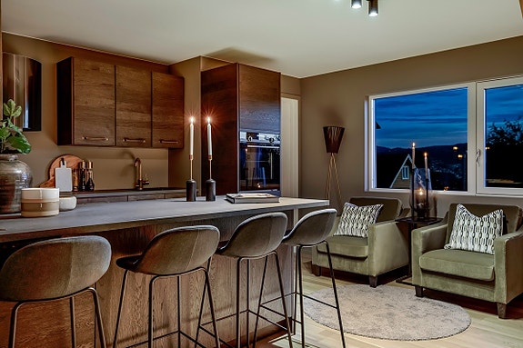 Kjøkken: Nytt kjøkken fra KVIK med oppvaskmaskin, stekeovn, induksjons-platetopp, kjøleksap og kombiskap. Siemens. Kjøkken er fullt utstyrt. Møblert med spisebord og stoler.