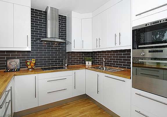 Kjøkken med integrerte hvitevarer.