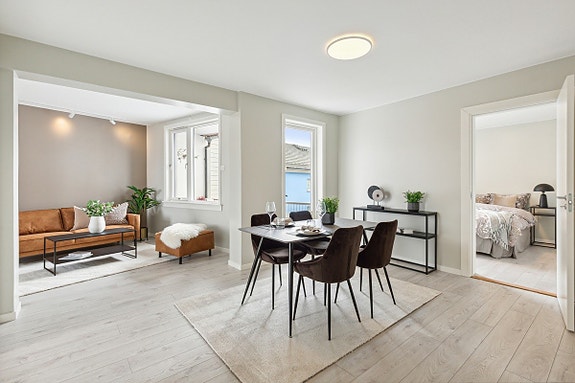 Man entrer leiligheten i en gang/inngangsparti. Her finnes det en naturlig plass rett innenfor inngangsdøren til typisk sko og ytterbekledning. Fra inngangspartiet finner man tilkomst til badet, ett av soverommene samt videre innover i oppholdsrommet. Leilighetens oppholdsrom er romslig, og har flere møbleringsmuligheter. Oppholdsrommet er todelt, så her har man mulighet for både spisestue og tv-stue. Kjøkkenet er nytt, har et moderne uttrykk og inneholder alle nødvendigheter. Dette har en integrert hvitevarepakke fra merket Siemens, og inneholder kombi kjøl/frys, stekeovn, platetopp og oppvaskmaskin. Ellers har kjøkkenet rikelig med oppbevaringsplass.