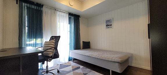 Møblert med seng på 120cm, stort garderobeskap på 120 cm, skrivepult, stol og bokhylle.
