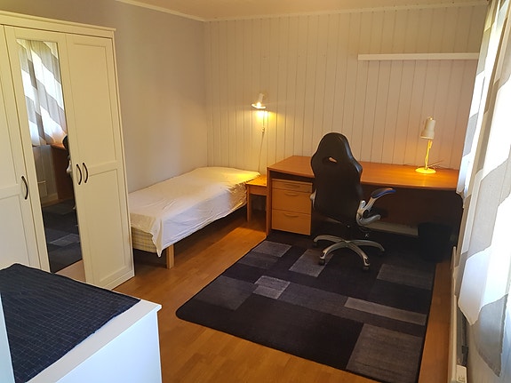 🪑 Møblert med seng, skap, kommode, hylle, stol og skrivebord. Tilgang til kjøkken med eget kjøleskap, spisestue, 2 bad, vaskemaskin og internett.