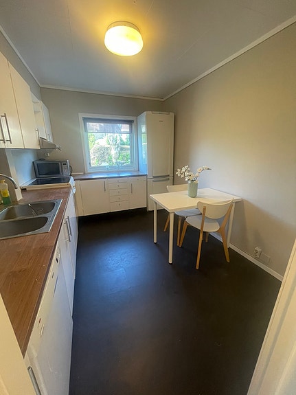 Leiligheten er på 90m2, med stor stue og kjøkken, bad, 2 soverom og bod i kjelleren. Leietaker disponerer en parkeringsplass.