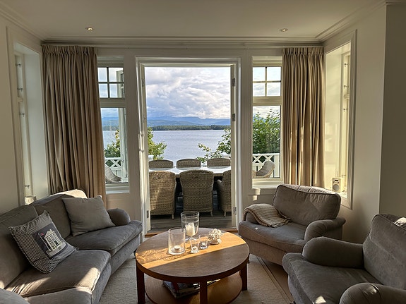 Fra terrassen har du utsikt over fjellene i sør, som Molde er kjent for, stranden og hagen. Du kan gå ut i hagen og ned til stranden fra terrassen via en stor og bred trapp. Det er også mulig å komme seg ned til stranden med barnevogn eller lignende.